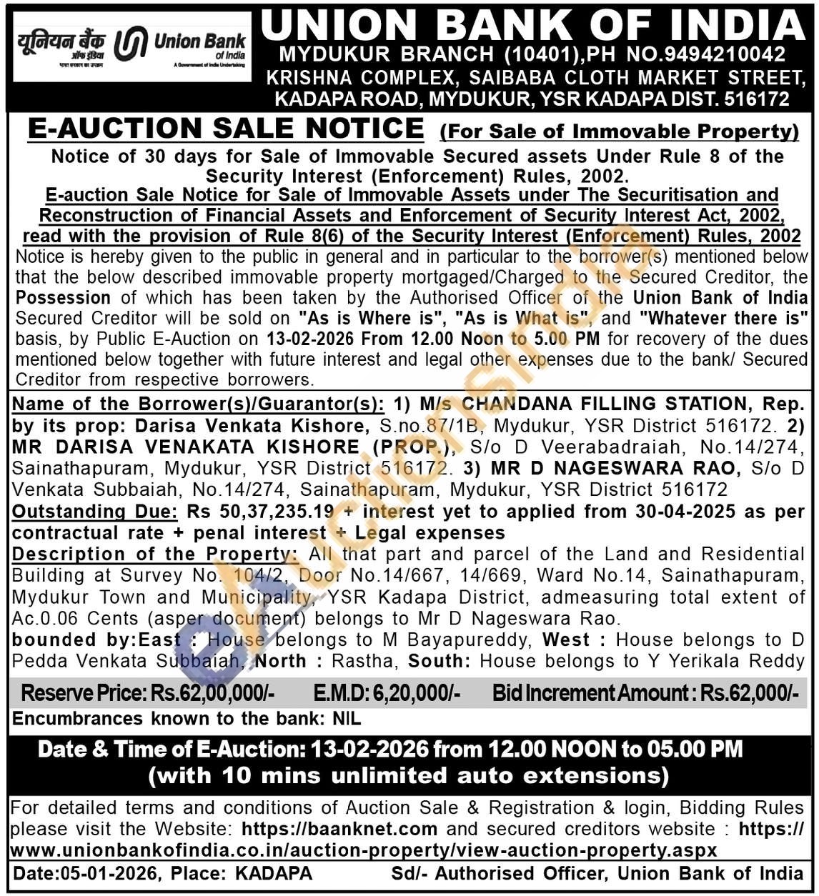 Description of the Property: All that part and parcel of the Land and Residential Building at Survey No. 104/2, Door No. 14/667, 14/669, Ward No.14, Sainathapuram, Mydukur Town and Municipality, YSR Kadapa District, admeasuring total extent of Ac.0.06 Cents (asper document) belongs to Mr D Nageswara Rao. bounded by: East House belongs to M Bayapureddy, West House belongs to D Pedda Venkata Subbaiah, North Rastha, South: House belongs to Y Yerikala Reddy
