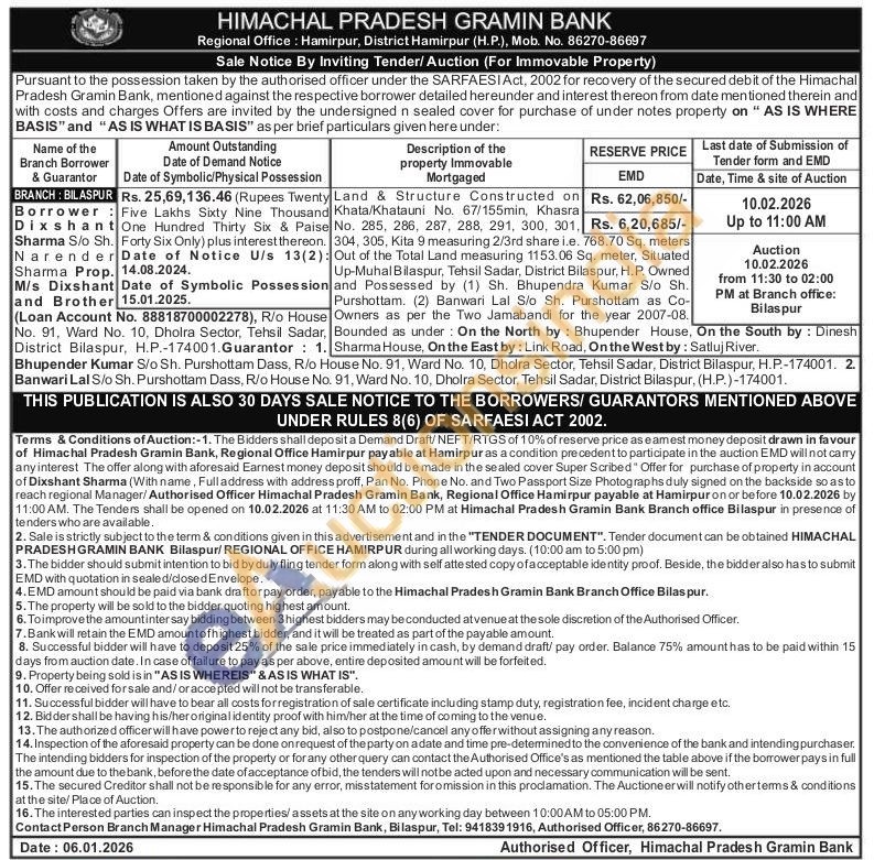 Land & Structure Constructed onKhata/Khatauni No. 67/155min, Khasra No. 285, 286, 287, 288, 291, 300, 301,304, 305, Kita 9 measuring 2/3rd share i.e. 768.70 Sq. meters : Out of the Total Land measuring 1153.06 Sq. meter, Situated Up-Muhal Bilaspur, Tehsil Sadar, District Bilaspur, H.P. Owned and Possessed by (1) Sh. Bhupendra Kumar S/o Sh. Purshottam. (2) Banwari Lal S/o Sh. Purshottam as Co-Owners as per the Two Jamabandi for the year 2007-08.