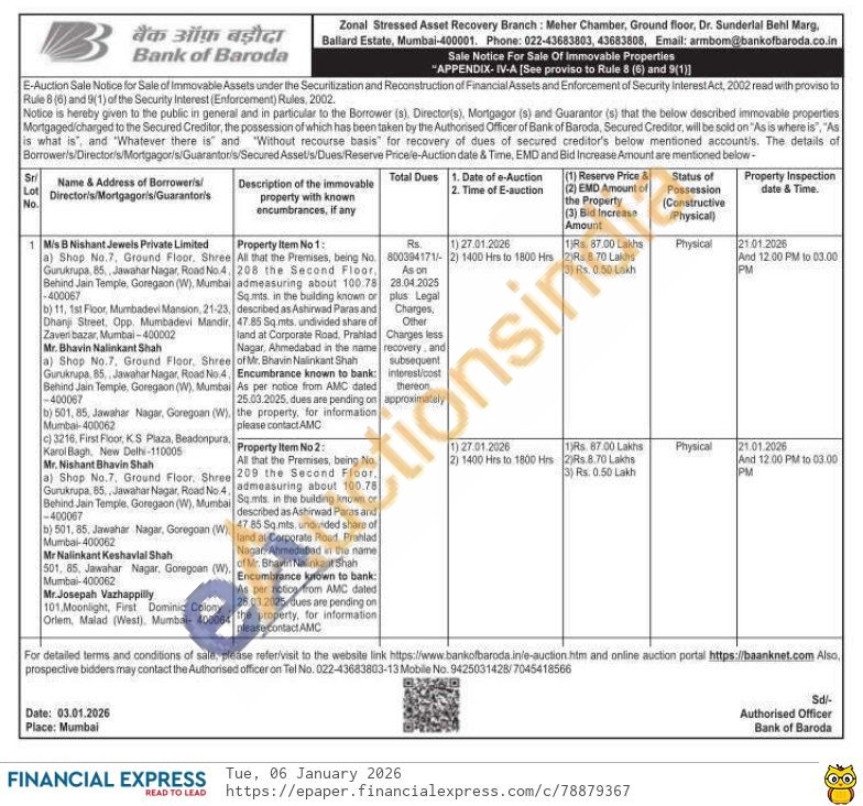 All that the Premises, being No. 209 the Second Floor, admeasuring about 100.78 Sq.mls in the building known or described as Ashirwad Paras and 47.85 Sq.mts. undivided share of land at Corporate Road, Prahlad Nagar. Ahmedabad in the name of Mr. Bhavin Nalinkant Shah