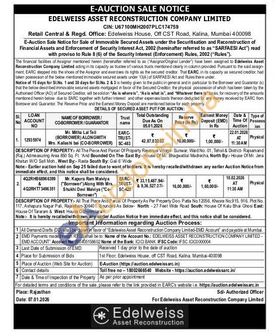 DESCRIPTION OF PROPERTY:- All The Piece And Parcel Of Property Revenue Village- Sunwar, Ward No. 01, Tehsil & District- Rajsamand (Raj.) Admeasuring Area 850 Sq. Ft. "And Bounded On The East By:-House Of Mr. Bhagwatilal Madrecha. North By:- House Of Mr. Jera Khatun W/O Safi Moh., West By:- Rasta South By: Gali 6" Wide