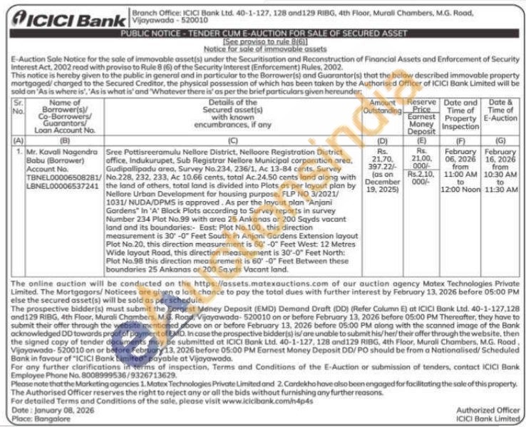 Sree Pottisreeramulu Nellore District, Nelloore Registration District office, Indukurupet, Sub Registrar Nellore Municipal corporation area. Gudipallipadu area, Survey No. 234, 236/1, Ac 13-84 cents, Survey No.228, 232, 233, Ac 10.66 cents, total Ac. 24.50 cents land along with the land of others, total land is divided into Plots as per layout plan by Nellore Urban Development for housing purpose. FLP NO 3/2021/1031/NUDA/DPMS is approved. As per the layout plan "Anjani Gardens" In 'A' Block Plots according to Survey reports in survey Number 234 Plot No.99 with area 25 Ankanas or 200 Sqyds vacant land and its boundaries: East: Plot No.100, this direction measurement is 30-0" Feet South: in Anjani Gardens Extension layout Plot No.20, this direction measurement is 60-0 Feet West: 12 Metres Wide layout Rood, this direction measurement is 30°-0" Feet North: Plot No.98 this direction measurement is 60-0 Feet Between these boundaries 25 Ankanas or 200 Sq.yds Vacant land.
