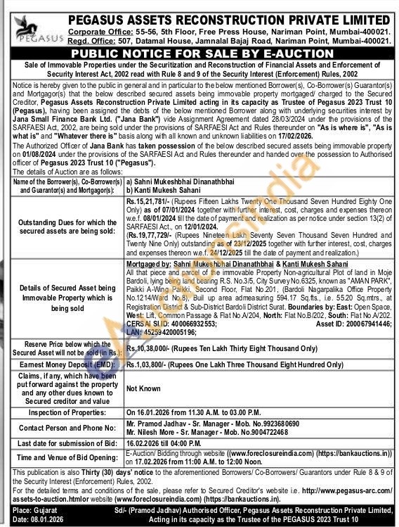 All that piece and parcel of the immovable Property Non-agricultural Plot of land in Moje Bardoli, lying being land bearing R.S. No.3/5, City Survey No.6325, known as "AMAN PARK", Paikki A-Wing Paikki, Second Floor, Flat No.201, (Bardoli Nagarpalika Office Property No.1214/Ward No.8), Buil up area admeasuring 594.17 Sq.fts., ie. 55.20 Sq.mtrs., at Registration District & Sub-District Bardoli District Surat. Boundaries by: East: Open Space, West: Lift, Common Passage & Flat No A/204, North: Flat No.B/202, South: Flat No A/202.