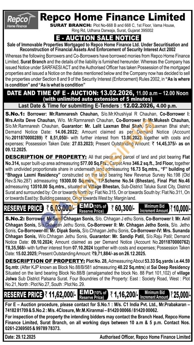 All that piece and parcel of land and plot bearing Flat No.314, super built-up area admeasuring 577.00 Sq.Fts., Carpet Area 346.2 sq.ft., 3rd Floor, together with undivided proportionate share in underneath land admeasuring 16.73 Sq.mtrs., "F" building of "Bhagya Laxmi Residency" constructed on the land bearing New Revenue Survey No.198 (Old Rev.S.No.287) admeasuring 19300.00 Sq.mtrs., T.P.Scheme No.54 (Bhestan), Final Plot No.46 admeasuring 13510.00 Sq.mtrs., situated at Village Bhestan, Sub-District Taluka Surat City, District Surat and surrounded by: On or towards North by: Flat No.315, On or towards South by: Flat No.311, On or towards East by: Building passage, On or towards West by: Margin land