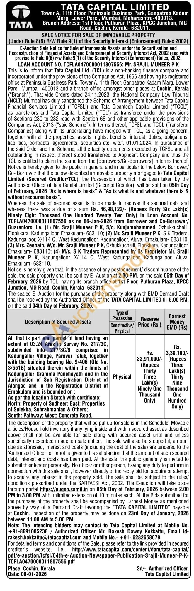 All that is part and parcel of land having an extent of 03.24 Ares in Survey No. 217/3C, subdivided into 217/3C/9 comprised in Kadungallur Village, Paravur Taluk, together with the building bearing No. 9/406 (Old No. 3/551B) situated therein within the limits of Kadungallur Gramma Panchayath and in the Jurisdiction of Sub Registration District of Alangad and in the Registration District of Ernakulam and is bounded on: As per the location Sketch with certificate: North: Property of Sudheer; East: Properties of Sulekha, Subrahmanian & Others; South: Pathway; West: Concrete Road.