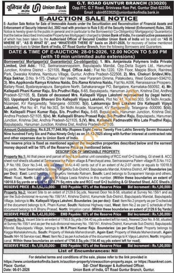 DESCRIPTION OF IMMOVABLE PROPERTY: Property No.1; All that piece and parcel of land & Industrial unit consisting of RCC roof G+2 building, Gl sheet & ACC sheet roof shed/s situated at Serinarasanna Palem village & Panchayat area, Serinarasanna Palem village R.S.No. 11/2, LP No.189, Door No.3-44, site an extent of Ac.4-40 cents out of it an extent of Ac.2-07 cents or equals to 10018.8 Sq.yards, Near Swamalatha Spintex, Kanumolu Sub-District, Bapulapadu Mandal, Krishna District, AP. Boundaries (as per Doc): East: Land belongs to Pusunuru Venkata Ratnam, South: Land belongs to Surapaneni Vanaja and others, West: Road, North: Land belongs to Adapa Leela Krishna in this number. (Within these boundaries an extent of 10018.8 Sq.yards or equal to 8376.71 Sq.mtrs site and RCC roof G+2 building & Gl Sheeted Shed, ACC Shed/s.)