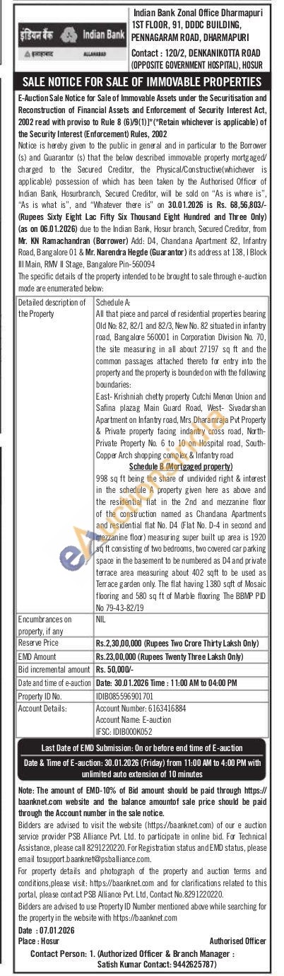 All that piece and parcel of residential properties bearing Old No: 82, 82/1 and 82/3, New No. 82 situated in infantry road, Bangalore 560001 in Corporation Division No. 70, the site measuring in all about 27197 sq ft and the common passages attached thereto for entry into the property and the property is bounded on with the following boundaries: East-Krishniah chetty property Cutchi Menon Union and Safina plazag Main Guard Road, West- Sivadarshan Apartment on Infantry road, Mrs Dharamraja Pvt Property & Private property facing indantry cross road, North-Private Property No. 6 to 10 on Hospital road, South-Copper Arch shopping complex & Infantry road