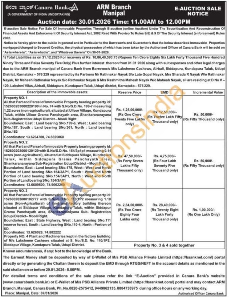 All that Part and Parcel of Immovable Property bearing property id: 152600203000102777 with S.No/S.D.No. 110/1P2 measuring 1.10 acres (Non-Agricultural) of land and factory building thereon situated at Siddapur Village, Kundapura Taluk, within Siddapur Grama Panchayath area, Shankaranarayana Sub- Registration Udupi District-Mooli Right.