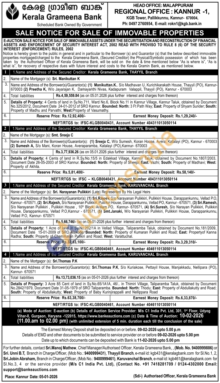 Details of Property: 4 Cents of land in Sy. No.711, Ward No.6, Block No.11 in Kannur Village, Kannur Taluk, obtained by Document No.325/2012, Document Date 24-01-2012 of SRO Kannur. Bounded: North: 3 Ft Path Way, East: Property of Shyam Sunder; South: Property of Madhu and Parvathi, West:Property of Vasumathy.