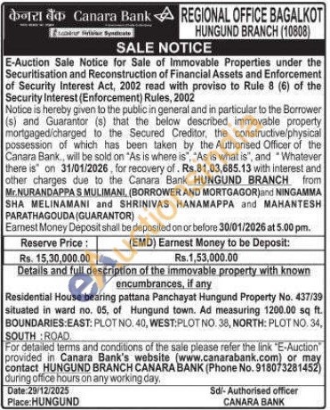 Details and full description of the immovable property with known encumbrances, if any : Residential House bearing pattana Panchayat Hungund Property No. 437/39 situated in ward no. 05, of Hungund town. Ad measuring 1200.00 sq ft. BOUNDARIES:EAST: PLOT NO. 40, WEST:PLOT NO. 38, NORTH: PLOT NO: 34, SOUTH ROAD