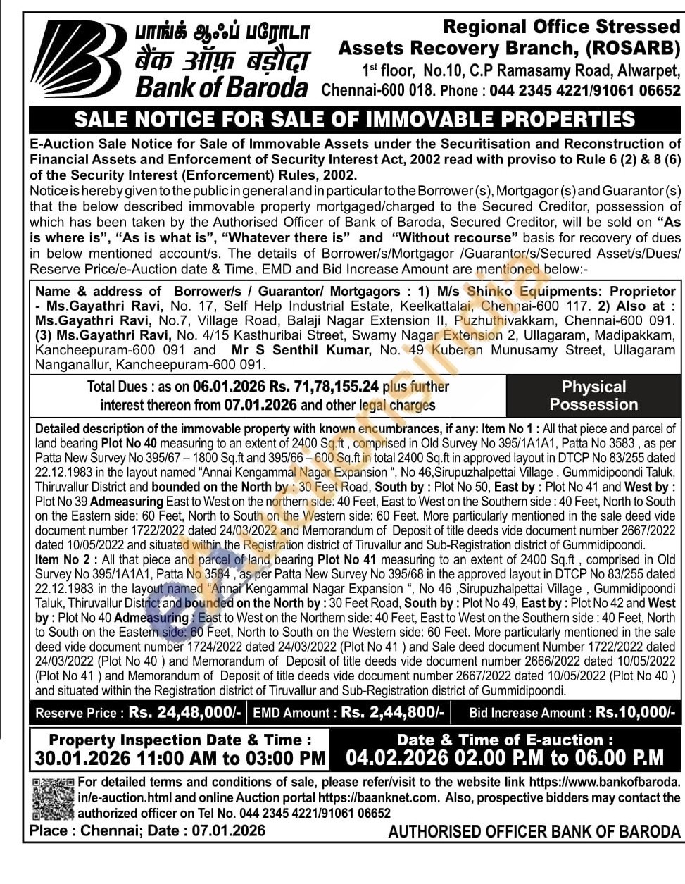 Detailed description of the immovable property with known encumbrances, if any: Item No 1: All that piece and parcel of land bearing Plot No 40 measuring to an extent of 2400 Sq.ft, comprised in Old Survey No 395/1A1A1, Patta No 3583, as per Patta New Survey No 395/67-1800 Sq.ft and 395/66-600 Sq.ft in total 2400 Sq.ft in approved layout in DTCP No 83/255 dated 22.12.1983 in the layout named "Annai Kengammal Nagar Expansion", No 46, Sirupuzhalpettai Village, Gummidipoondi Taluk, Thiruvallur District and bounded on the North by: 30 Feet Road, South by: Plot No 50, East by: Plot No 41 and West by: Plot No 39 Admeasuring East to West on the northern side: 40 Feet, East to West on the Southern side: 40 Feet, North to South on the Eastern side: 60 Feet, North to South on the Western side: 60 Feet. More particularly mentioned in the sale deed vide document number 1722/2022 dated 24/03/2022 and Memorandum of Deposit of title deeds vide document number 2667/2022 dated 10/05/2022 and situated within the Registration district of Tiruvallur and Sub-Registration district of Gummidipoondi. Item No 2: All that piece and parcel of land bearing Plot No 41 measuring to an extent of 2400 Sq.ft, comprised in Old Survey No 395/1A1A1, Patta No 3584, as per Patta New Survey No 395/68 in the approved layout in DTCP No 83/255 dated 22.12.1983 in the layout named "Annai Kengammal Nagar Expansion", No 46, Sirupuzhalpettai Village, Gummidipoondi Taluk, Thiruvallur District and bounded on the North by: 30 Feet Road, South by: Plot No 49, East by: Plot No 42 and West by: Plot No 40 Admeasuring: East to West on the Northern side: 40 Feet, East to West on the Southern side: 40 Feet, North to South on the Eastern side: 60 Feet, North to South on the Western side: 60 Feet. More particularly mentioned in the sale deed vide document number 1724/2022 dated 24/03/2022 (Plot No 41) and Sale deed document Number 1722/2022 dated 24/03/2022 (Plot No 40) and Memorandum of Deposit of title deeds vide document number 2666/2022 dated 10/05/2022 (Plot No 41) and Memorandum of Deposit of title deeds vide document number 2667/2022 dated 10/05/2022 (Plot No 40) and situated within the Registration district of Tiruvallur and Sub-Registration district of Gummidipoondi