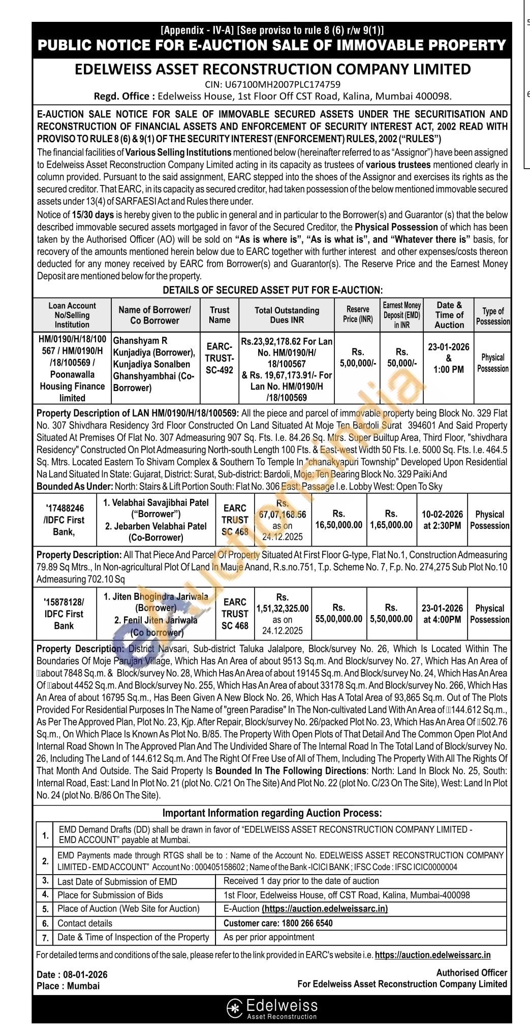 Property Description: All That Piece And Parcel Of Property Situated At First Floor G-type, Flat No. 1, Construction Admeasuring 79.89 Sq Mtrs., In Non-agricultural Plot Of Land In Mauje Anand, R.s.no.751, T.p. Scheme No. 7, F.p. No. 274,275 Sub Plot No. 10 Admeasuring 702.10 Sq