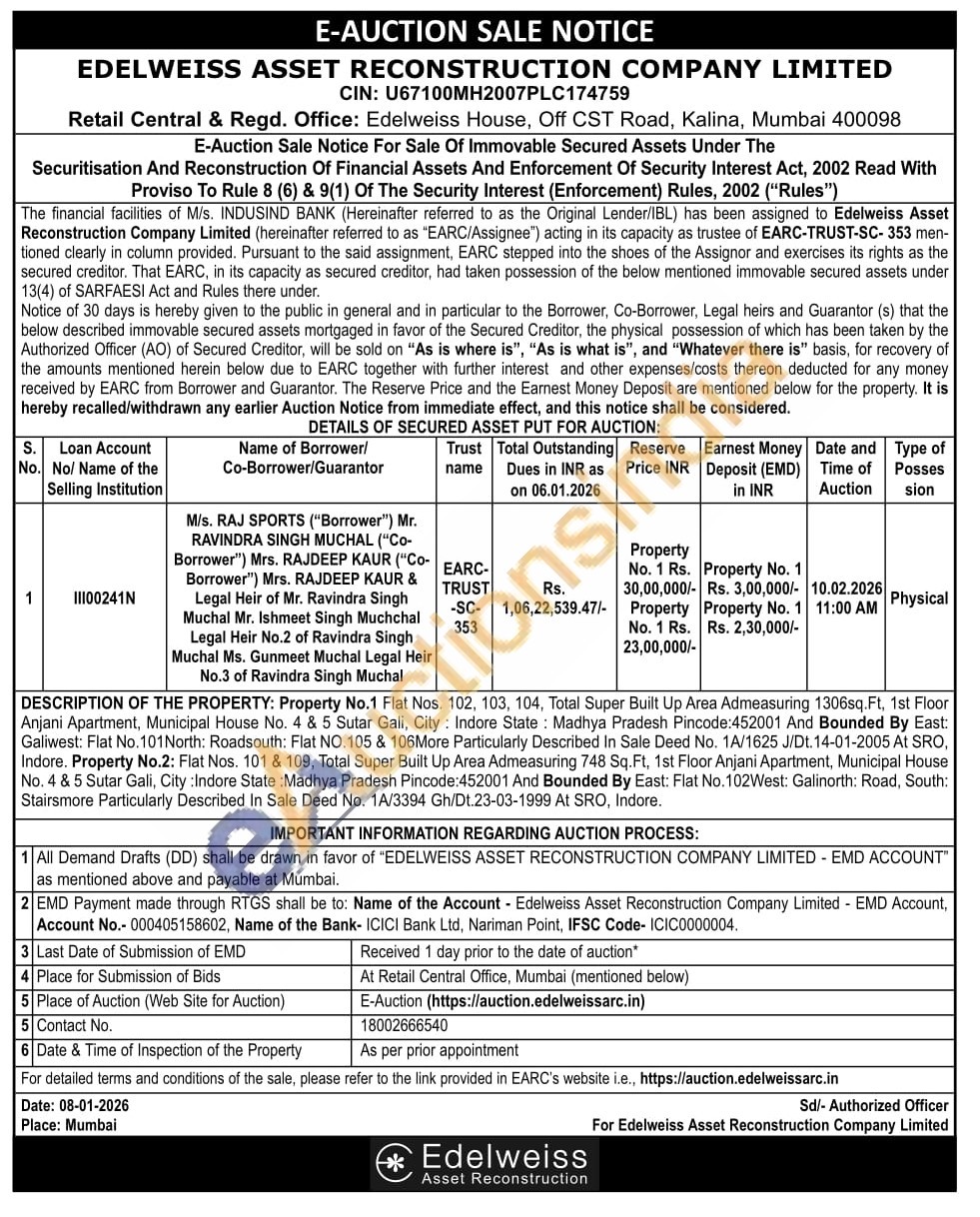DESCRIPTION OF THE PROPERTY: Property No.1 Flat Nos. 102, 103, 104, Total Super Built Up Area Admeasuring 1306sq.Ft, 1st Floor Anjani Apartment, Municipal House No. 4 & 5 Sutar Gali, City: Indore State: Madhya Pradesh Pincode:452001 And Bounded By East: Galiwest: Flat No. 101North: Roadsouth: Flat NO.105 & 106More Particularly Described In Sale Deed No. 1A/1625 J/Dt.14-01-2005 At SRO, Indore.