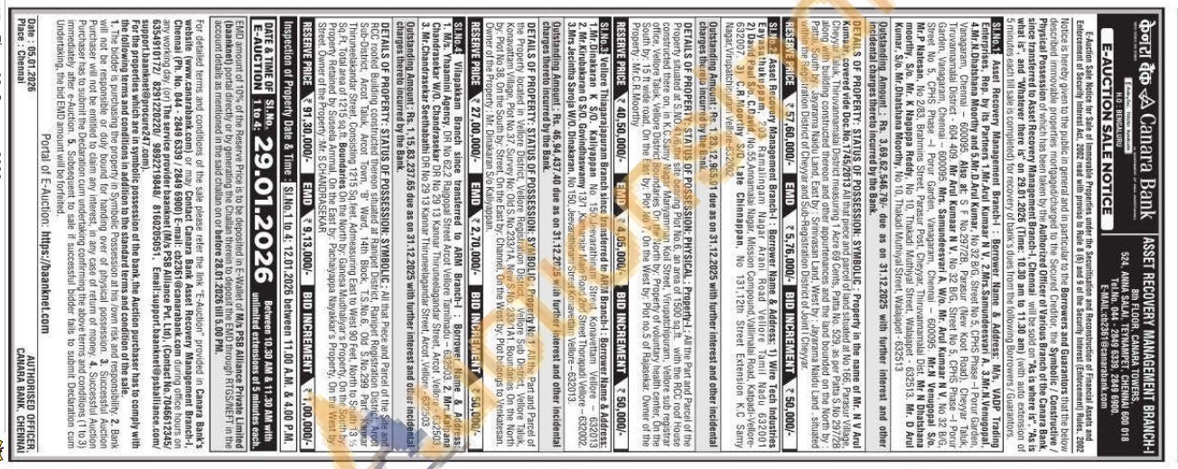 DETAILS OF PROPERTY: STATUS OF POSSESSION: SYMBOLIC: All mat Piece and Parcel of the Site and RCC roofed Building constructed thereon situated at Ranipet District, Ranipet Registration District, Arcot Sub-District, Arcot Taluk, Arcot Town, Ward, 14th Block, TS No 6. Old S.No 299 Part, Kannar Thiruneelakandar Street, Consisting 1215 Sq feet. Admeasuring East to West 90 Feet, North to South 18 Sqft, Total area of 1215 sq.ft. Boundaries On the North by. Ganesa Mudhaliyar's Property, On the South by Property Retained by Suseela Ammal. On the East by: Pachhaiyappa Nayakkar's Property, On the West by Street. Owner of the Property Mr 5 CHANDRASEKAR