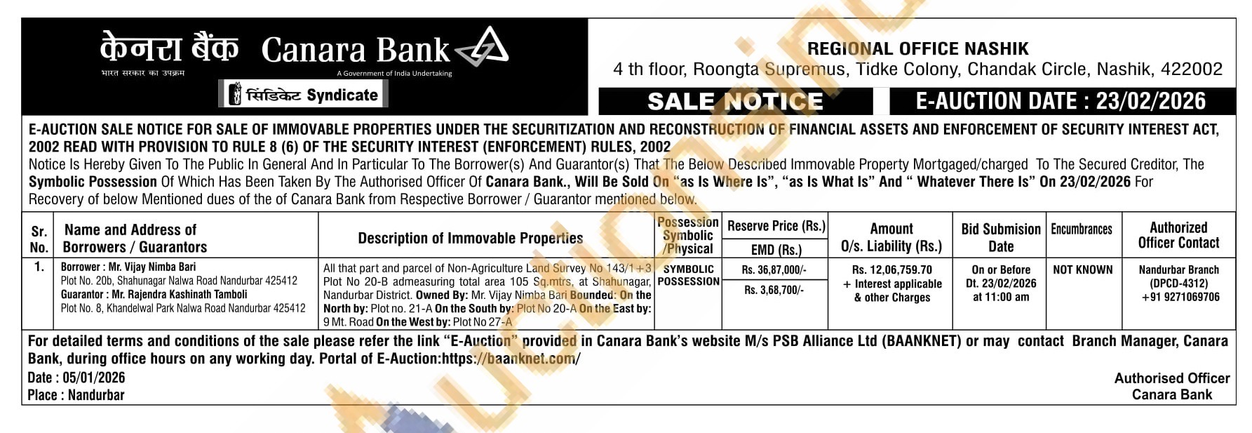 All that part and parcel of Non-Agriculture Land Survey No 143/1+3 Plot No 20-B admeasuring total area 105 Sq.mtrs, at Shahunagar, Nandurbar District. Owned By: Mr. Vijay Nimba Bari Bounded: On the North by: Plot no. 21-A On the South by: Plot No 20-A On the East by: 9. Mt. Road On the West by: Plot No 27-A