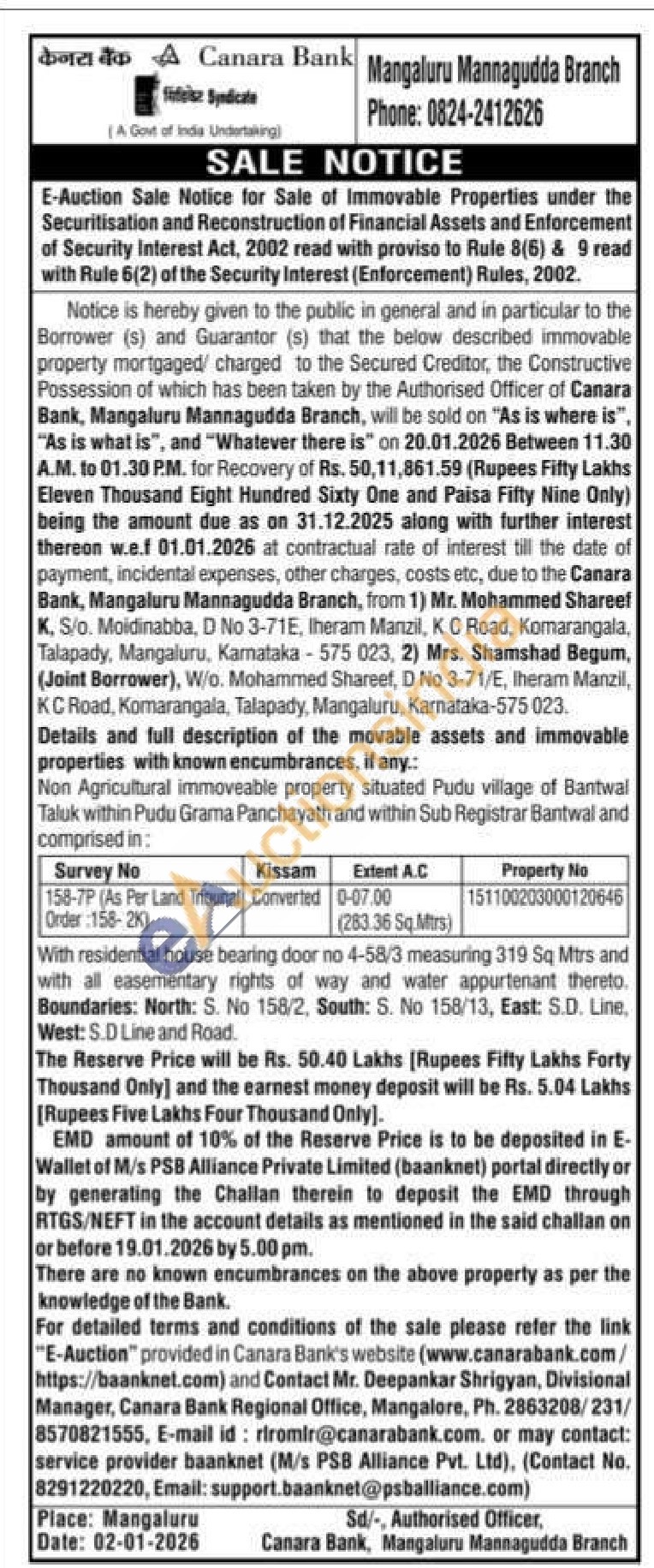 Details and full description of the movable assets and immovable properties with known encumbrances, if any.: Non Agricultural immoveable property situated Pudu village of Bantwal Taluk within Pudu Grama Panchayath and within Sub Registrar Bantwal and comprised in With residential house bearing door no 4-58/3 measuring 319 Sq Mtrs and with all easementary rights of way and water appurtenant thereto. Boundaries: North: S. No 158/2, South: S. No 158/13, East: S.D. Line, West: S.D Line and Road