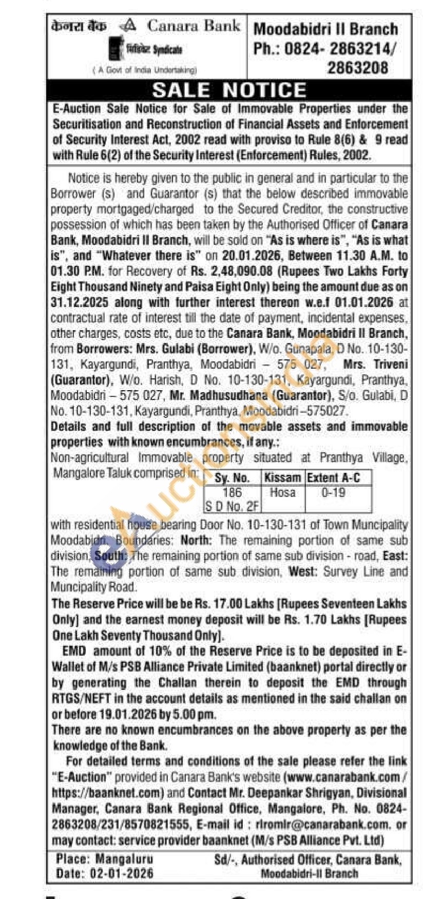 Details and full description of the movable assets and immovable properties with known encumbrances, if any.: Non-agricultural Immovable property situated at Pranthya Village, Mangalore Taluk comprised in: with residential house bearing Door No. 10-130-131 of Town Muncipality Moodabidri. Boundaries: North: The remaining portion of same sub division, South: The remaining portion of same sub division - road, East: The remaining portion of same sub division, West: Survey Line and Muncipality Road.