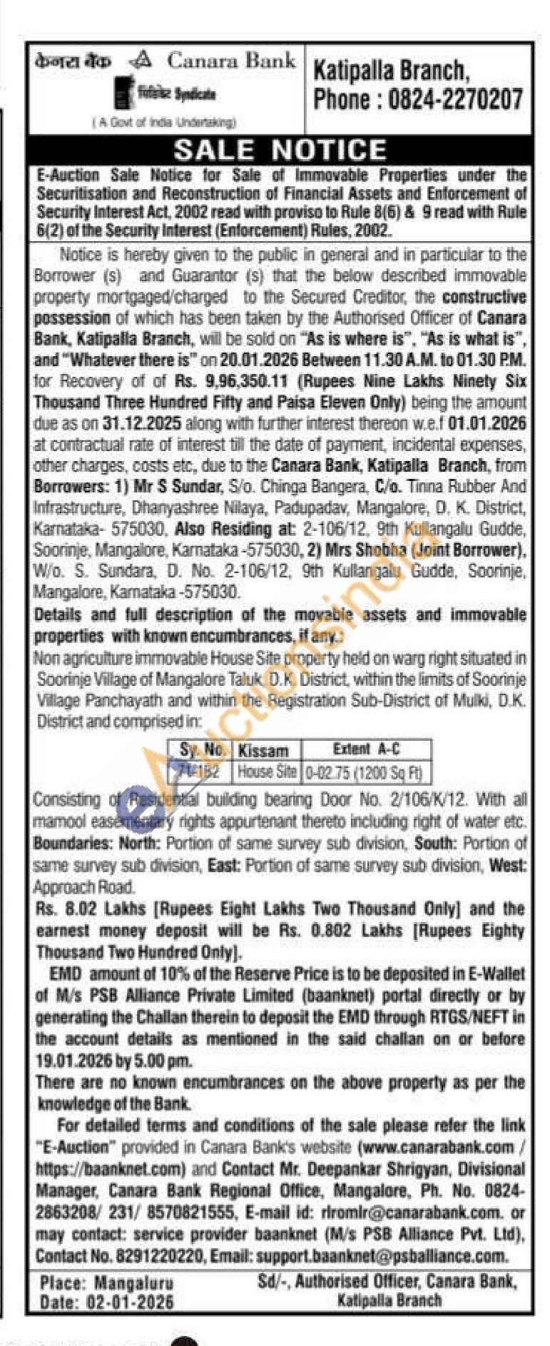 Details and full description of the movable assets and immovable properties with known encumbrances, if any.: Non agriculture immovable House Site property held on warg right situated in Soorinje Village of Mangalore Taluk, D.K. District, within the limits of Soorinje Village Panchayath and within the Registration Sub-District of Mulki, D.K. District and comprised in: Consisting of Residential building bearing Door No. 2/106/K/12. With all mamool easementary rights appurtenant thereto including right of water etc. Boundaries: North: Portion of same survey sub division, South: Portion of same survey sub division, East: Portion of same survey sub division, West: Approach Road.