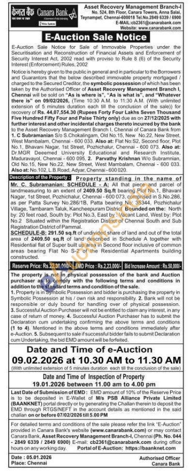 SCHEDULE A: All that piece and parcel of landmeasuring to an extent of 2409.50 Sq.ft bearing Plot No.1, Bhavani Nagar, 1st Street, Pozhichalur, Chennai-600 073, comprised in S.No.286, as per Patta Survey No.286/1B, Patta bearing No: 35344, Pozhichalur Village. Tambaram Taluk, Kancheepuram District Bounded on the: North by: 20 feet road, South by: Plot No.3, East by: Vacant Land, West by: Plot No.2 Situated within the Registration District of Chennai South and Sub Registration District of Pammal.