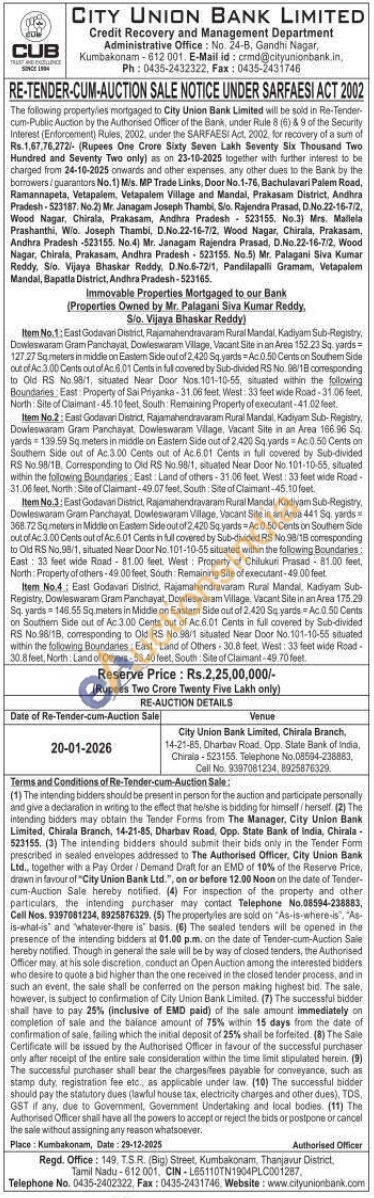 Bem No.1: East Godevan District, Rajamahendravaram Rural Mandat, Kadiyam Sub Registry, Dowleswatan Gram Panchayat Dowleswaram Village, Vacant Site in an Area 152.23 Sa yards 127.27 5 meters in middle on Eastem Side out of 2.420 Sq yards Ac 0.50 Cents on Southern Side out of Ac 3.00 Cents out of Ac 6.01 Cents in full covered by Sub-dieded RS No. 96/18 comesponding to Old RS No.98/1, stuated Near Door Nos 101-10-55, situated within the following Boundaries East Property of Sai Priyanka-31.00 feet. West: 33 feet wide Road-31.06 feet. North Site of Claimant-45.10 leet, South: Remaining Property of executart-41.02 feet Item No.2: East Godavari Din Rajamaherchavaram Rural Mandal. Kadiyam Sub-Registry, Dowleswaram Gram Panchayat, Dowleswaram Wage, Vacant Site in an Area 10636 Sq yards 138.59 50 meters in middle on Eastem Site out of 2,420 Sq yants Ac3.50 Cents on Southem Side out of Ac3.00 Cents out of AcEDT Cents in full covered by Sub-divided RS No.98/18. Corresponding to Old RS No. 90/1, situated Near Door No.101-10-55, situated within the following Boundaries, East Land of others 31.20 feet, West: 33 feet wide Road-31.06 feet, North: Site of Claimant-49 07 feet South Site of Clamant-45.10 feet berg Boundaries Bem No.3: East Godavan District, Rajamuanendravaram Rural Mandal Kadiyam Sub-Registry, Dowleswaram Gram Panchayat Dowleswaram Village, Vacant Site in an Area 441 50 yards 368.72 60 meters in Middle on Eastem Side out of 2.4210 Sq yards Ac 0.50 Centh on Southern Sid out of Ac 3.00 Cents out of Ac 01 Cents in ful covered by Sub-divided RS No. 98/18 comesponding to Old RS No.98/1, situated Near Door No: 101-10-55 situated within the following Boundaries East: 33 feet wide Raed-81.00 feet. West Property of Chilluku Prasad-81.00 feet, North Property of others-4000 feet, South Remaining Site of executant-49.00 feet Item No.4 East Gortavan District, Rajamahendravaram Rural Mandal, Kadiyam Sub Registry Dowleswaram Gram Panchayat Dowleswaram Village, Vacant Site in an Area 175.29 Sq yards 148.55 Sq.meters in Middie on Eastem Side out of 2.420 5 yards Ac 1.50 Cents on Southern Side out of Ac 3.00 Carts out of Ac6:01 Cents in full covered by Sub-divided RS No 88/18, corresponding to Old RS No 8/1 situated Near Door No. 101-10-55 situated within the following Boundaries, East: Land of Others-30.8 feet. West: 33 Seef wide Road-30.8 feet, North Land of Others-53-40 feet, South Site of Claimant-4870 feet.