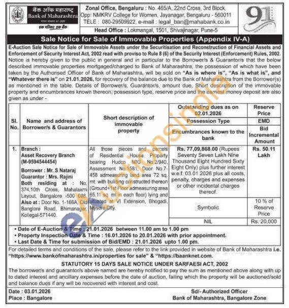 All those pieces and parcels of Residential House Property bearing Hudca MIG No 2/940, Assessment No.1581, Door No.7-458 admeasuring land area 72 sq. mt. with building constructed thereon (Ground+1st Floor admeasuring area 65.11 sq. mt in each floor) lying and situated at VI Extension, Bhogadi Mysore City.