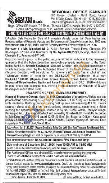 Name of Property Owner: Noushad MD, Description of property: All that part and parcel of land admeasuring 45.73 Ares [41.68 Ares + 4.05 Ares) ie. 113 Cents along with residential Building thereon having built up area admeasuring 419 Sq. meters (approx) along with all other constructions, improvements, easementary rights existing and appurtenant thereon situated in Sy No 19/246 within Muliyar Village, Kasaragod Taluk, Kasaragod District and owned by Noushad MD morefully described in Sale Deed no. 2065/2016 dated 12-05-2016 of Sub Registrar Office Kasaragod. BOUNDARIES: North: Property of Abdul Khader, South: Property of Hameed, East: Property of Madhava Bhat, West: Road