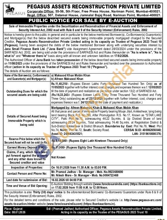 Mortgaged by: Afreen Maksood Khan & Maksood Khan Mobin Khan All that piece and parcel of immovable Property bearing Mouje Jitali, Ankleshwar, lying being land bearing Block R.S. No.788, After Promulgation R.S. No.17, Known as "STAR LAKE CITY", Paiki Plot No.75, admeasuring 46.22 Sq.mtrs. & Up Divided Share of land admeasuring 28.24 Sq.mtrs., Total admeasuring 74.46 Sq.mtrs. at Registration District & Sub-District Ankleshwar & District Bharuch, Boundaries by: East: Plot No.76, West: Plot No.74, North: Plot No.72, South: Society Road. Asset ID: 200063435521; CERSAI SIID: 400062656848; LAN: 31519610000376