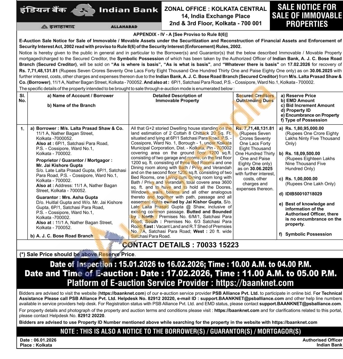 All that G+2 storied Dwelling house standing on the land estimation of 2 Cottah 8 Chittack 20 Sq. Ft. situated and lying at 6P/1 Satchasi Para Road, P.S.-Cossipore, Ward No. 1, Borough 1, under Kolkata Municipal Corporation, Dist. Kolkata, Pin-700002 covering area on the ground floor 1200 sq.ft. consisting of two garage and rooms, on the first floor 1200 sq. ft. consisting of three Bed Rooms and one Dining room along with Bath / Privy and Verandah and on the second floor 1200 sq.ft. consisting of two Bed Rooms, one Living cum Dining room long with Bath / Privy and Verandah, total covere area 3600 sq. ft. and to have and to hold all the Doores, Windows, walls, beams and all other analogous thereto and together with path, passage and all easement rights owned by Jai Kishor Gupta, S/o. Late Lalta Prasad Gupta @ Shaw, inclusive of existing common passage. Butted and Bounded by North: Premises No. 6/M/1, Satchasi Para Road; South Premises No. 6/3 Satchasi Para Road; East: Vacant Land and R.T Shed of Premsies No. 7A, Satchasi Para Road; West 20 ft. wide Satchasi Para Road,