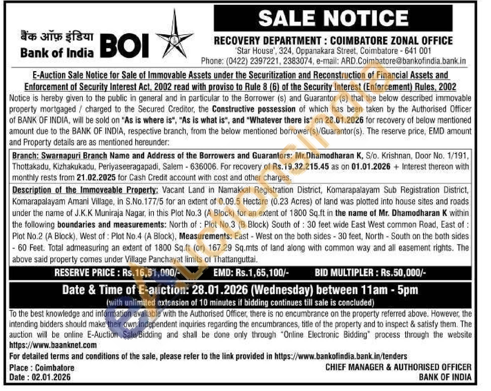 Description of the Immoveable Property: Vacant Land in Namakkal Registration District, Komarapalayam Sub Registration District, Komarapalayam Amani Village, in S.No.177/5 for an extent of 0.09.5 Hectare (0.23 Acres) of land was plotted into house sites and roads under the name of J.K.K Muniraja Nagar, in this Plot No.3 (A Block) for an extent of 1800 Sq.ft in the name of Mr. Dhamodharan K within the following boundaries and measurements: North of Plot No.3 (B Block) South of: 30 feet wide East West common Road, East of: Plot No.2 (A Block), West of: Plot No.4 (A Block), Measurements: East-West on the both sides 30 feet, North-South on the both sides -60 Feet. Total admeasuring an extent of 1800 Sq.ft (or) 167.29 Sq.mts of land along with common way and all easement rights. The above said property comes under Village Panchayat limits of Thattanguttai.