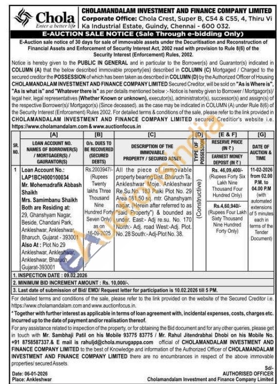 All the piece of immovable property bearing Dist. Bharuch Ta. Ankleshwar Moje. Ankleshwar Re.Su.No. 183 Paiki Plot No. 29 Area 181.50 sq. mtr. Ghanshyam nagar. (Herein after referred to as "said Property") & bounded as under. East:- Adj re.su. No. 170 North: Adj, road West:-Adj. Plot. No. 28 South:-Adj-Plot No. 38.