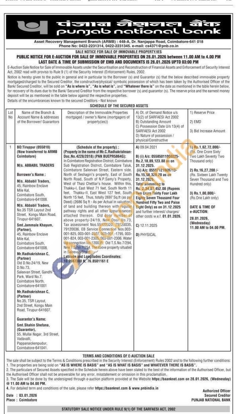 In Coimbatore Registration District, Coimbatore Sub Registration District, Coimbatore Taluk, Coimbatore Saleevan Street, Eastern side. North of Seshagiri's property, East of South North Road, South of N.P.Samy's Property, West of Thasi Chettiar's house. Within this. Thakku-1, East West 71 feet. South North 11 feet. Thakku-11, East West 127 feet, South North 15 feet, Thus, totally 2697 Sq.ft (as per Deed) (2686 Sqft-As per Actual in valuation) of land and building thereon with regular pathway rights and all other appurtenances attached thereon. Old door number of above property-24/19, New Door No. 73. Tax assessment Nos.55122320, 79120035. 79120036, EB Service Connection Nos. 003-001-825.003-001-2307.003-001.-1795,003-001-824,003-001-2305,003-001-2306 Water tap connection No. 120035. Old T.S.No. 7/294, New T.S.No. 7/254. The above property situated in Saleevan Street.