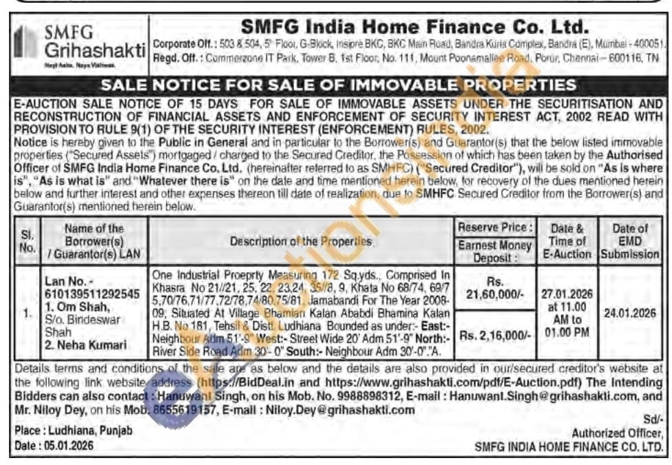 One Industrial Proeprty Measuring 172 Sq.yds., Comprised In Khasra No 21/21, 25, 22, 23,24, 35//8, 9, Khata No 68/74, 69/7 5,70/76,71/77,72/78,74/80,75/81, Jamabandi For The Year 2008-09, Situated At Village Bhamian Kalan Ababdi Bhamina Kalan H.B. No 181, Tehsil & Distt. Ludhiana Bounded as under:- East:-Neighbour Adm 51-9" West:- Street Wide 20' Adm 51'-9" North:-River Side Road Adm 30-0" South:- Neighbour Adm 30-0"."A.