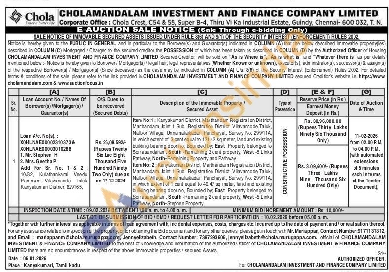 Item No:1: Kanyakumari District, Marthandam Registration District, Marthandam Joint 1 Sub Registration District, Vilavancode Taluk, Nalloor Village, Unnamalaikadai Panchayat, Survey No. 299/11A, in which extent of 3 cent equal to 121.42 sq meter, land and existing building bearing door no, Bounded by; East Property belonged to Somasundaram, South-Remaining 3 cent property, West -5 Links Pathway, North-Remaining Property and Pathway,Item No: 2: Kanyakumari District, Marthandam Registration District, Marthandam Joint 1 Sub Registration District, Vilavancode Taluk, Nalloor Village, Unnamalaikadai Panchayat, Survey No. 299/11A, in which extent of 1 cent equal to 40.47 sq meter, land and existing building bearing door no, Bounded by: East Property belonged to Somasundaram, South-Remaining 2 cent property, West -5 Links Pathway, North-Stephen Property.