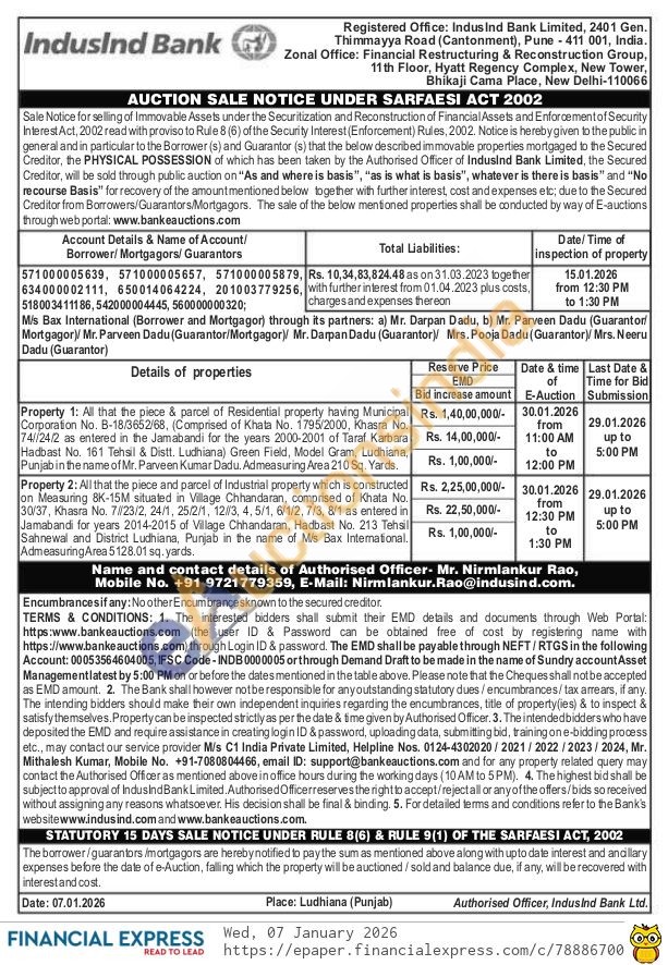 Property 2: All that the piece and parcel of Industrial property which is constructed on Measuring BK-15M situated in Village Chhandaran, comprised of Khata No. 30/37, Khasra No. 7//23/2, 24/1, 25/2/1, 12/3, 4, 5/1, 6/1/2, 7/3, 8/1 as entered in Jamabandi for years 2014-2015 of Village Chhandaran, Hadbast No. 213 Tehsil Sahnewal and District Ludhiana, Punjab in the name of M/s Bax International. Admeasuring Area 5128.01 sq. yards.