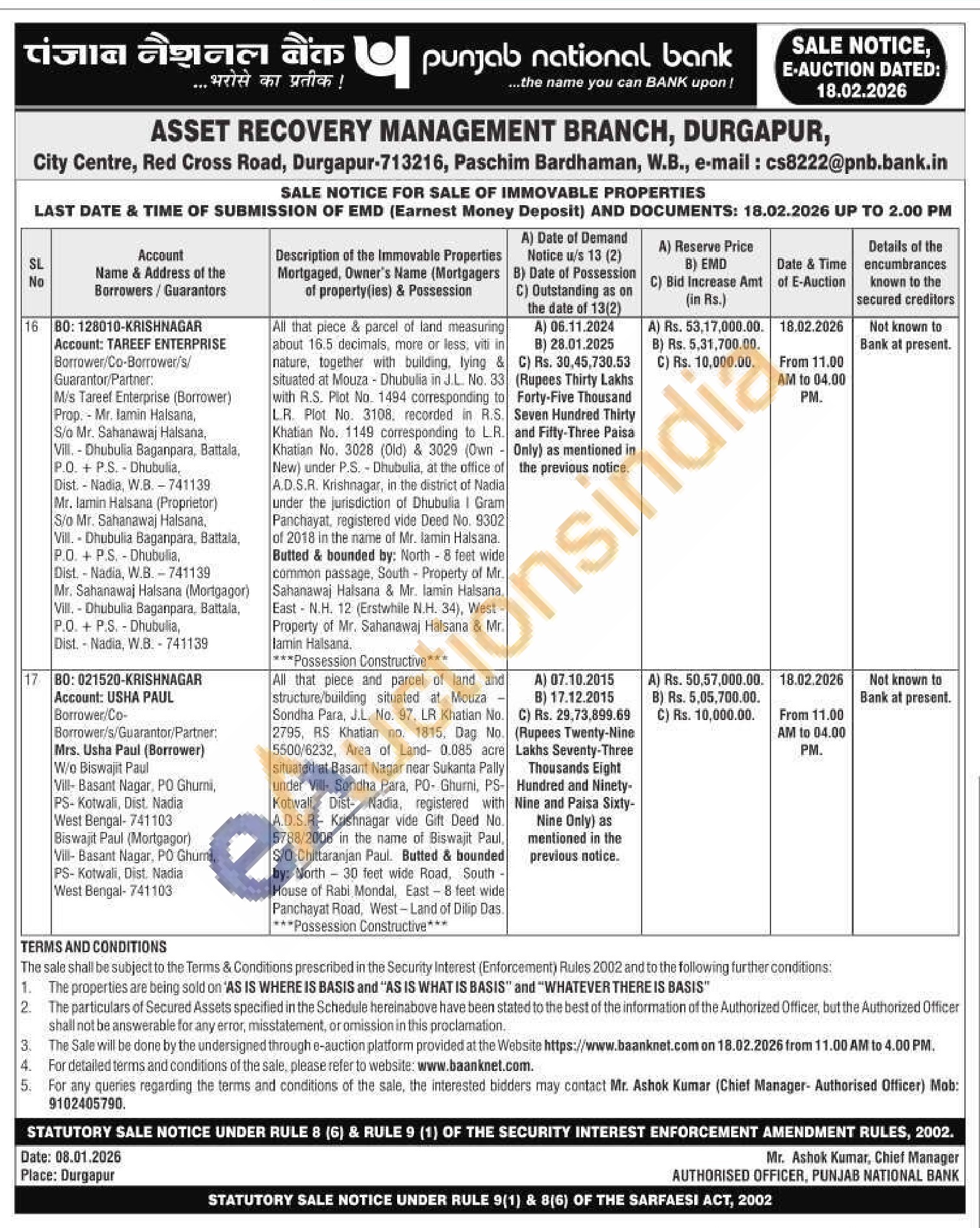 Mr. Ashok Kumar (Chief Manager- Authorised Officer) Mob: 9102405790.