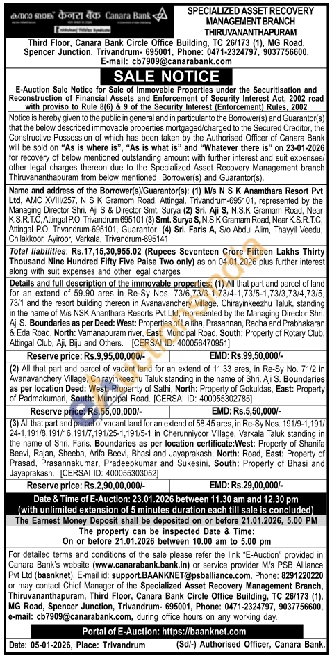 (2) All that part and parcel of vacant land for an extend of 11.33 ares, in Re-Sy No. 71/2 in Avanavanchery Village, Chirayinkeezhu Taluk standing in the name of Shri. Aji S. Boundaries as per location Deed: West: Properrty of Sathi, North: Property of Gokuldas, East: Property of Padmakumari, South: Muncipal Road. [CERSAI ID: 400055302785]