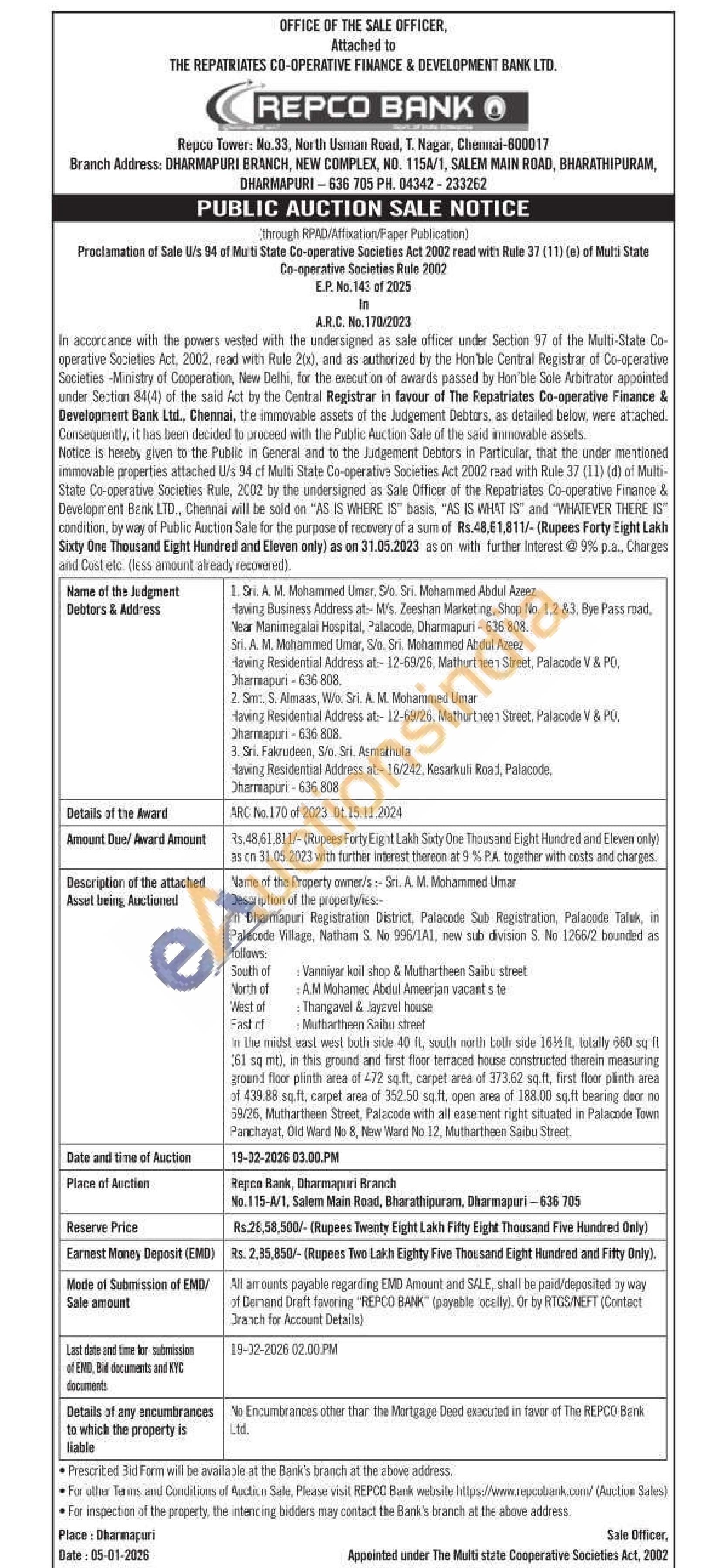 In Dharmapuri Registration District, Palacode Suh Registration, Palacade Taluk, in Pakacode Wilage. Natham S. No 995/141, new sub division S. No 1266/2 bounded an follows South of Vanniyar koil shop & Muthartheen Saibu street North of AM Mamed Abdul Ameerjan vacant site West of East of Thanga & layovel house Muthartheen Saibo shee in the midst sast west both side 40 ft. south marth both side 155ft totally 660 sq if 161 sq mit, this ground and first for terraced house constructed therein measuring ground floor plinth area of 472 sq.ft, carpet area of 373.62 soft, first floor plasth area 439.88 sq. ft, carpet area of 352.50 sqft, open area of 188.00 sq ft bearing door no 53/25, Muthar theen Street, Palacode with all easement right situated in Palacode Town Panchayat, Old Ward No. 8, New Ward No. 12, Muthartheen Saibu Street
