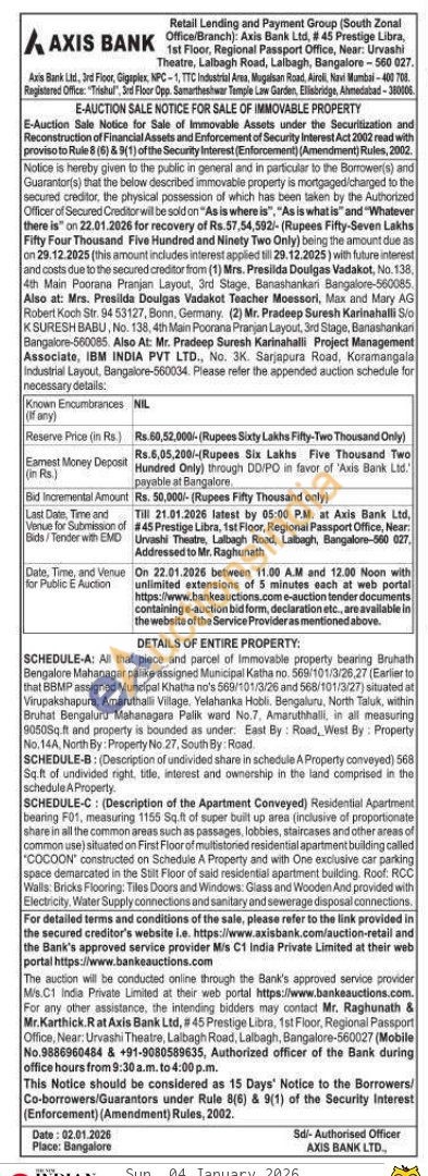 SCHEDULE-A: All that piece and parcel of Immovable property bearing Bruhath Bengalore Mahanagar palike assigned Municipal Katha no. 569/101/3/26,27 (Earlier to that BBMP assigned Muncipal Khatha no's 569/101/3/26 and 568/101/3/27) situated at Virupakshapura, Amaruthalli Village. Yelahanka Hobli. Bengaluru, North Taluk, within Bruhat Bengaluru Mahanagara Palik ward No.7, Amaruthhalli, in all measuring 9050Sq.ft and property is bounded as under. East By: Road, West By: Property No. 14A, North By: Property No.27, South By: Road SCHEDULE-B: (Description of undivided share in schedule A Property conveyed) 568 Sq.ft of undivided right, title, interest and ownership in the land comprised in the schedule A Property. SCHEDULE-C: (Description of the Apartment Conveyed) Residential Apartment bearing F01, measuring 1155 Sq.ft of super built up area (inclusive of proportionate share in all the common areas such as passages, lobbies, staircases and other areas of common use) situated on First Floor of multistoried residential apartment building called COCOON' constructed on Schedule A Property and with One exclusive car parking space demarcated in the Stit Floor of said residential apartment building. Roof: RCC Walls: Bricks Flooring: Tiles Doors and Windows: Glass and Wooden And provided with Electricity, Water Supply connections and sanitary and sewerage disposal connections.