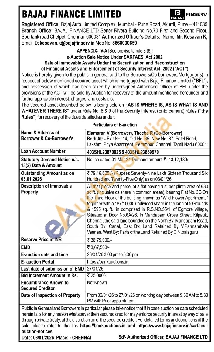 All that piece and parcel of a flat having a super plinth area of 630 sq.ft. (inclusive os share in common areas), bearing Flat No. 3G On the Third Floor of the building known as "Wild Flower Apartments" together with a 187/10000 undivided share in the land of 5 Grounds & 1595 sq. ft., in comprised in R.S.NO.55/1, of Egmore Village, Situated at Door No.6A/26, In Mandapam Cross Street, Kilpauk, Chennai, the said land bounded on the North By: Mandapam Road, South By: Canal, East By: Land Retained By V.Pannambala Vannan, West By: Parts of the Land Retained By C.N.balaguru