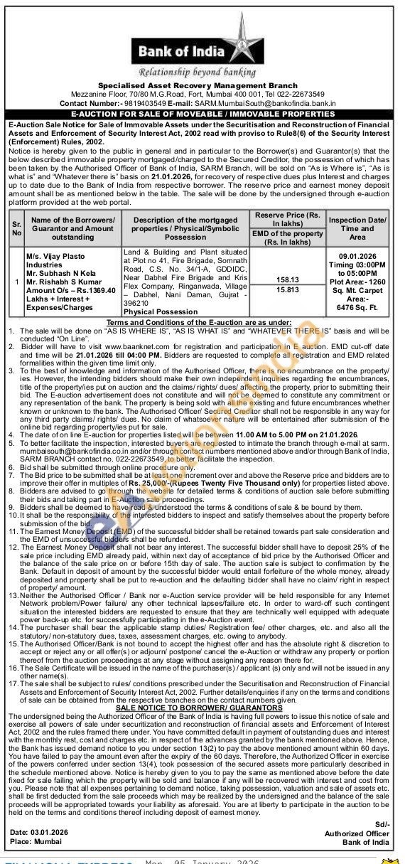 Land & Building and Plant situated at Plot no 41, Fire Brigade, Somnath Road, C.S. No. 34/1-A, GODIDC, Near Dabhel Fire Brigade and Kis Flex Company. Ringariwada, Village Dabhel, Nani Daman, Gujrat 396210 Physical Possession