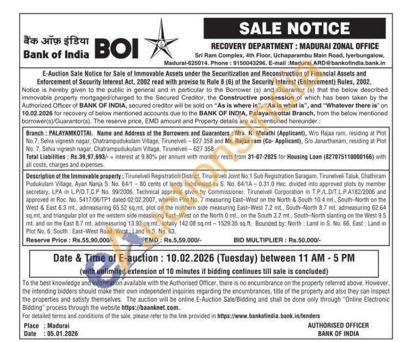 Description of the Immovable property: Tirunelveli Registration District, Tirunelveli Joint No.1 Sub Registration Saragam, Tirunelveli Taluk, Chathiram Pudukulam Village, Ayan Nanja S. No. 64/180 cents of lands subdivided as S. No. 64/1A-0.31.0 Hec. divided into approved plots by member secretary, LPA in L.P/D.T.C.P No. 99/2006, Technical approval given by Commissioner, Tirunelveli Corporation in T.P./L.D/T.L.P.A182/2006 and approved in Roc. No. 5417/06/TP1 dated 02.02.2007, wherein Plot No. 7 measuring East-West on the North & South 10.4 mt., South-North on the West & East 6.3 mt, admeasuring 65.52 sq.mt, plot on the northern side measuring East-West 7.2 mt., South-North 8.7 mt. admeasuring 62.64 sq.mt, and triangular plot on the western side measuring East-West on the North 0 mt., on the South 3.2 mt., South-North slanting on the West 9.5 mt. and on the East 8.7 mt. admeasuring 13.92 sq.mt., totally 142.08 sq.mt-1529.35 sq.ft. Bounded by: North: Land in S. No. 66, East: Land in Plot No. 6, South East-West Road, West: Land in S. No. 63.