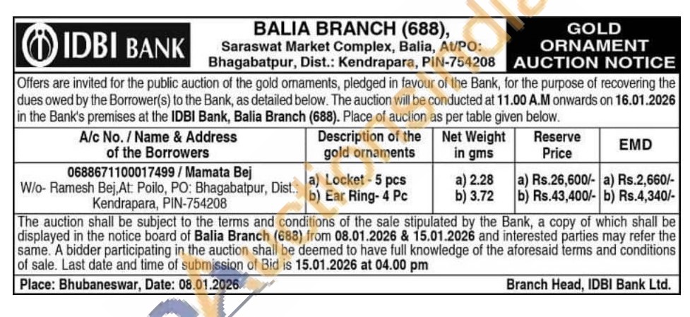 IDBI Bank Gold Auctions Auction in Bhubaneswar