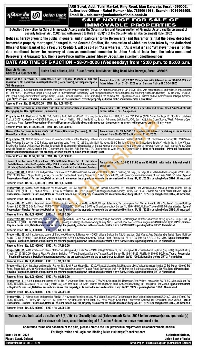 Contact Authorised Officer Rahul Kumar Mo. 7859011911, Branch: 7016965509. Email ID - arb.surat@unionbankofindia.bank.in