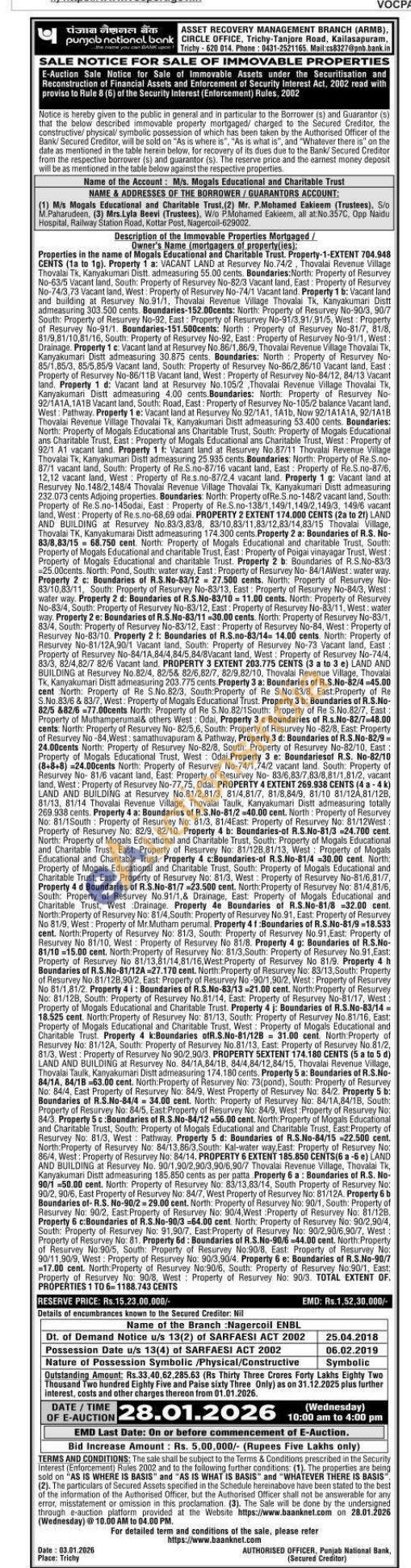 Property 1 a: VACANT LAND at Resurvey No.74/2, Thovalai Revenue Village Thovalai Tk, Kanyakumari Distt. admeasuring 55.00 cents. Boundaries: North: Property of Resurvey No-63/5 Vacant land, South: Property of Resurvey No-82/3 Vacant land, East: Property of Resurvey No-74/3,73 Vacant land, West: Property of Resurvey No-74/1 Vacant land. Property 1 b: Vacant land and building at Resurvey No.91/1, Thovalai Revenue Village Thovalai Tk, Kanyakumari Distt admeasuring 303.500 cents. Boundaries-152.00cents: North: Property of Resurvey No-90/3, 90/7 South: Property of Resurvey No-92, East: Property of Resurvey No-91/3,91/91/5, West: Property of Resurvey No-91/1. Boundaries-151.500cents: North Property of Resurvey No-81/7, 81/8, 81/9,81/10,81/16, South: Property of Resurvey No-92, East: Property of Resurvey No-91/1, West: Drainage. Property 1 c: Vacant land at lesurvey No.86/1,86/9, Thovalai Revenue Village Thovalai Tk, Kanyakumari Distt admeasuring 30.875 cents. Boundaries: North Property of Resurvey No-85/1.85/3, 85/5,85/9 Vacant land, South: Property of Resurvey No-86/2,86/10 Vacant land, East: Property of Resurvey No-86/118 Vacant land, West: Property of Resurvey No-84/12, 84/13 Vacant land. Property 1 d: Vacant land at Resurvey No.105/2, Thovalai Revenue Village Thovalai Tk, Kanyakumari Distt admeasuring 4.00 cents. Boundaries: North: Property of Resurvey No-92/1A1A,1A1B Vacant land, South: Road, East: Property of Resurvey No-105/2 balance Vacant land, West: Pathway. Property 1 e: Vacant land at Resurvey No 92/1A1, 1A1b, Now 92/1A1A1A, 92/1A1B Thovalai Revenue Village Thovalai Tk, Kanyakumari Distt admeasuring 53.400 cents. Boundaries: North: Property of Mogals Educational ans Charitable Trust, South: Property of Mogals Educational ans Charitable Trust, East: Property of Mogals Educational ans Charitable Trust, West: Property of 92/1 A1 vacant land. Property 1 f: Vacant land at Resurvey No.87/11 Thovalai Revenue Village Thovalai Tk, Kanyakumari Distt admeasuring 25.935 cents Boundaries: North: Property of Re. S.no-87/1 vacant land, South: Property of Re.S.no-87/16 vacant land, East: Property of Re.S.no-87/6, 12,12 vacant land, West Property of Re.s.no-87/2,4 vacant land. Property 1 g: Vacant land at Resurvey No.148/2,148/4 Thovalai Revenue Village Thovalai Tk, Kanyakumari Distt admeasuring 232.073 cents Adjoing properties. Boundaries: North: Property of Re. S no-148/2 vacant land, South: Property of Re.S.no-145odai, East: Property of Re.S.no-138/1,149/1,149/2,149/3, 149/6 vacant land, West: Property of Re.s.no-68,69 odai. PROPERTY 2 EXTENT 174.000 CENTS (2a to 21) LAND AND BUILDING at Resurvey No.83/3,83/8, 83/10,83/11,83/12,83/14,83/15 Thovalai Village, Thovalai TK, Kanyakumarai Distt admeasuring 174.300 cents Property 2 a: Boundaries of R.S. No-83/8,83/15 68.750 cent. North: Property of Mogals Educational and charitable Trust, South: Property of Mogals Educational and charitable Trust, East: Property of Poigai vinayagar Trust, West: Property of Mogals Educational and charitable Trust. Property 2 b. Boundaries of R.S.No-83/3 =25.00cents. North: Pond, South: water way, East: Property of Resurvey No-84/1AWest: water way. Property 2 c: Boundaries of R.S.No-83/12 27.500 cents. North: Property of Resurvey No-83/10,83/11, South: Property of Resurvey No-83/13, East: Property of Resurvey No-84/3, West: water way. Property 2 d: Boundaries of R.S.No-83/10 11.00 cents. North: Property of Resurvey