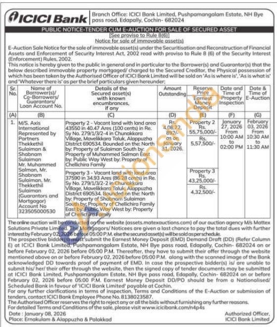 Vacant land with land area 43550 in 40.47 Ares (100 cents) in Re. Sy No. 279/1/3/2-4 in Chunakkora Village, Mavelikkara Taluk Alappuzha District 690534. Bounded on the: North by: Property of Sulaiman South by Property of Muhammed Salman East by: Public Way West by: Property of Chellichira Family