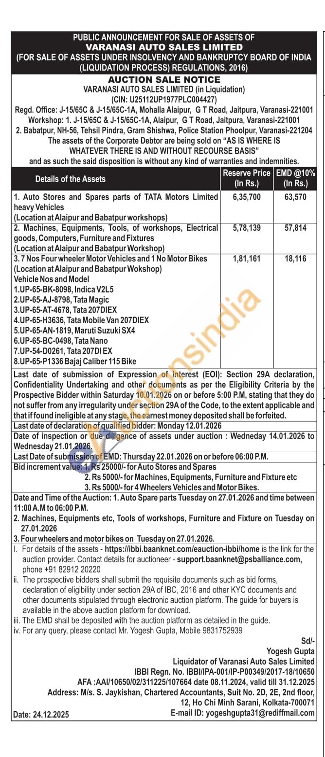Machines, Equipments, Tools, of workshops, Electrical goods, Computers, Furniture and Fixtures (Location at Alaipur and Babatpur Workshop