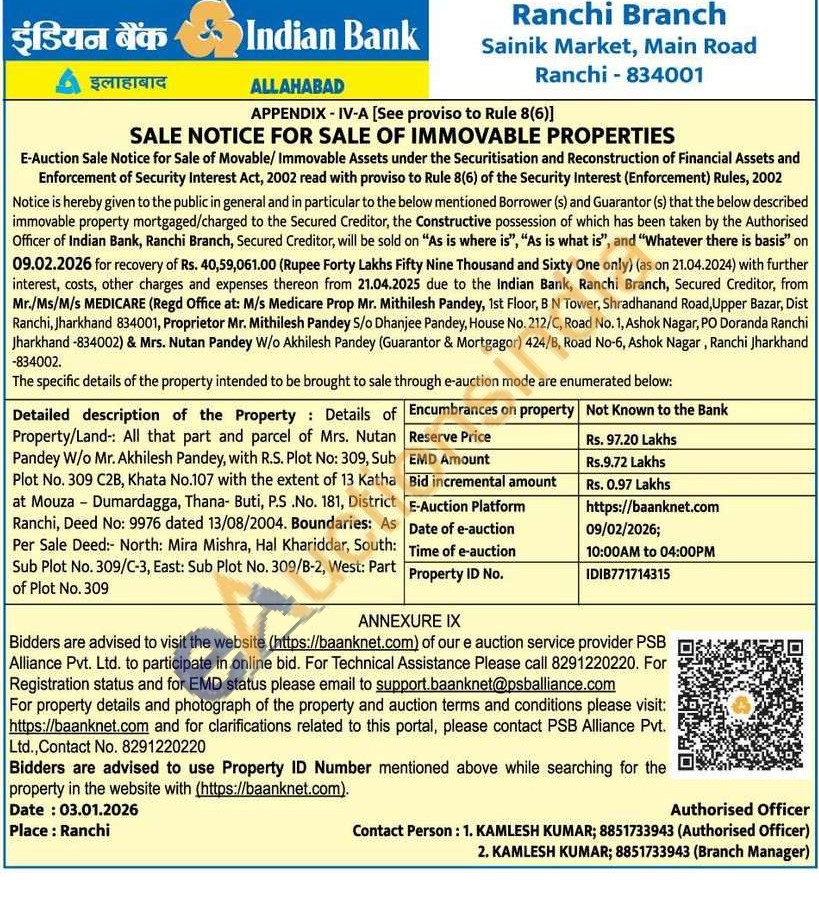Detailed description of the Property Details of Property/Land: All that part and parcel of Mrs. Nutan Pandey W/o Mr. Akhilesh Pandey, with R.S. Plot No: 309, Sub Plot No. 309 C2B, Khata No.107 with the extent of 13 Katha at Mouza - Dumardagga, Thana- Buti, P.S.No. 181, District Ranchi, Deed No: 9976 dated 13/08/2004. Boundaries: As Per Sale Deed:- North: Mira Mishra, Hal Khariddar, South: Sub Plot No. 309/C-3, East: Sub Plot No. 309/B-2, West: Part of Plot No. 309