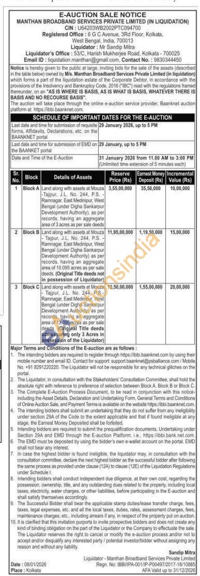 Land along with assets at Mouza Tajpur, J.L. No. 244, P.S. Ramnagar, East Medinipur, West Bengal (under Digha Sankarpur Development Authority) as per records, having an aggregate area of 10.095 acres as per sale deeds. (Original Title deeds not in possession of Liquidator