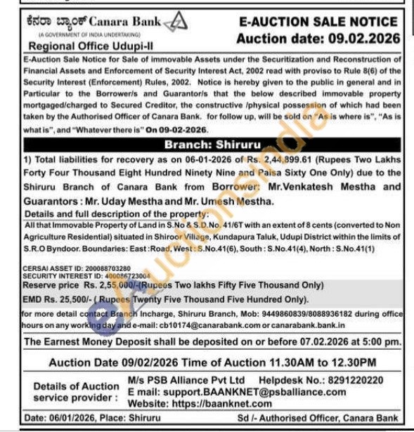 All that Immovable Property of Land in S.No & S.D.No. 41/6T with an extent of 8 cents (converted to Non Agriculture Residential) situated in Shiroor Village, Kundapura Taluk, Udupi District within the limits of S.R.O Byndoor. Boundaries: East: Road, West: S.No.41(6), South: S.No.41(4), North: S.No.41(1)