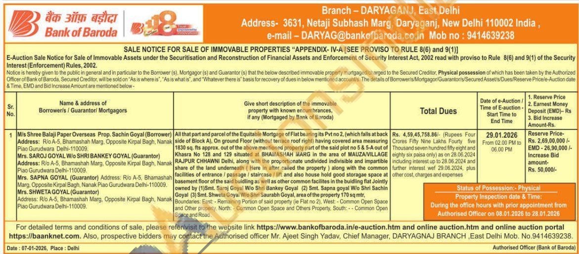 All that part and parcel of the Equitable Mortgage of Flat bearing its Pvt no 2. (which falls at back side of Block A), On ground Floor (without terrace roof right) having covered area measuring 1830 sq. fts approx. out of the above mentioned property part of the said plot no 5 & 5-A out of Khasra No 128 and 129 situated at BHAMASHAH SHAH MARG in the area of MAUZA/VILLAGE RAJPUR CHHAWNI Delhi, along with the proportionate undivided indivisible and impartible share of the land underneath (Here in after called the property) along with the common facilities of entrance/passage/ staircase / lift and also house hold good storagae space at basement floor of the said buidling as well as other common facilites in the buidling flat Jointly owned by (1)Smt. Saroj Goyal Wio Shri Bankay Goyal (2) Smt. Sapna goyal W/o Shri Sachin All that part and parcel of the Equitable Mortgage of Flat bearing its Pvt no 2. (which falls at back side of Block A), On ground Floor (without terrace roof right) having covered area measuring 1830 sq. fts approx. out of the above mentioned property part of the said plot no 5 & 5-A out of Khasra No 128 and 129 situated at BHAMASHAH SHAH MARG in the area of MAUZA/VILLAGE RAJPUR CHHAWNI Delhi, along with the proportionate undivided indivisible and impartible share of the land underneath (Here in after called the property) along with the common facilities of entrance/passage/ staircase / lift and also house hold good storagae space at basement floor of the said buidling as well as other common facilites in the buidling flat Jointly owned by (1)Smt. Saroj Goyal Wio Shri Bankay Goyal (2) Smt. Sapna goyal W/o Shri Sachin