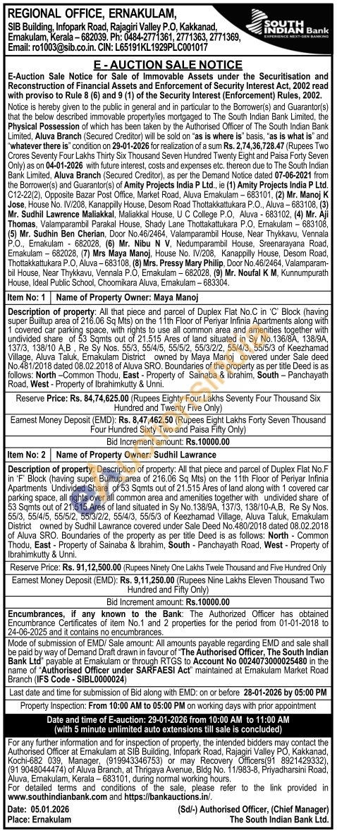 All that piece and parcel of Duplex Flat No.C in 'C' Block (having super Builtup area of 216.06 Sq Mts) on the 11th Floor of Periyar Infinia Apartments along with 1 covered car parking space, with rights to use all common area and amenities together with undivided share of 53 Sqmts out of 21.515 Ares of land situated in Sy No.136/8A, 138/9A, 137/3, 138/10 A,B, Re Sy Nos. 55/3, 55/4/5, 55/5/2, 55/3/2/2, 55/4/3, 55/5/3 of Keezhamad Village, Aluva Taluk, Emakulam District owned by Maya Manoj covered under Sale deed No.481/2018 dated 08.02.2018 of Aluva SRO. Boundaries of the property as per title Deed is as follows: North-Common Thodu, East Property of Sainaba & Ibrahim, South-Panchayath Road, West-Property of Ibrahimkutty & Unni.